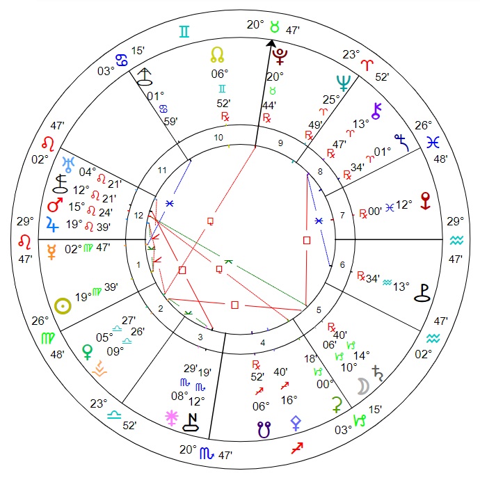 Discovery chart details: First quarter phase with Pluto on MC and Mercury rising out of sign. Stellium in Leo. Moon square Vesta; Sun semi-sextile Jupiter and semi-square Uranus; Mercury sextile Asbolus. Venus semi-square Jupiter and sesquiquadrate Pluto; Mars quincunx Saturn and sesquiquadrate Ceres; Saturn square Chiron. Chiron sextile Pholus; Nessus square Chariklo and trine Eris; Asbolus square Sedna.