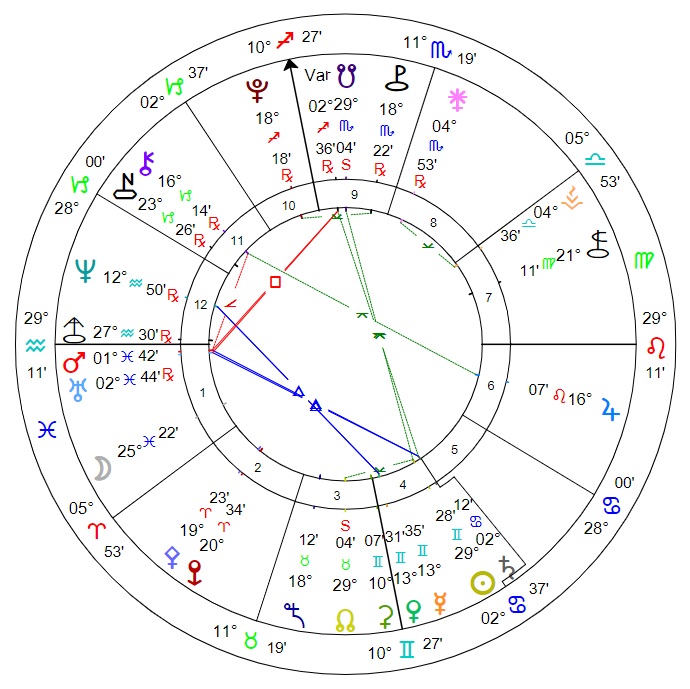 Discovery chart details: Disseminating chart close to last quarter with Gemini stellium including Ceres and Venus-Mercury on IC. Asbolus, Mars and Uranus rising. Varda was square Mars and Uranus and quincunx Saturn; Sun semi-sextile North Node. Mercury-Venus trine Neptune; Mars trine Saturn and semi-square Chiron. Jupiter quincunx Chiron; Saturn trine Uranus; Pluto quincunx and Pholus opposite Sedna. Chariklo quincunx Eris.