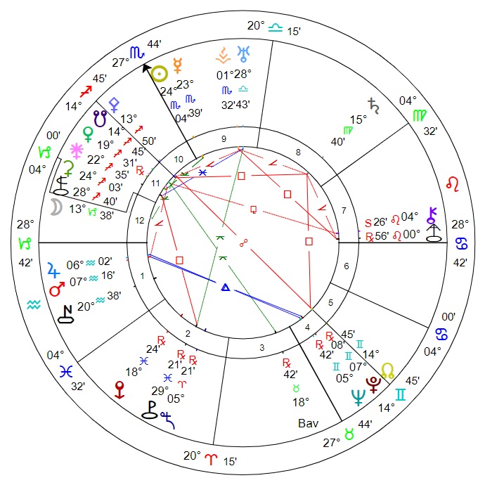 Discovery chart details: Noon. Bavaria was quincunx Venus and sextile Eris. Minor grand trine between Jupiter, Neptune and Sedna; minor T-square between Saturn, Vesta and Asbolus. Saturn square and Pallas opposite the North Node. Sun-Mercury semi-sextile Ceres; Venus sesquiquadrate Chiron. Mars trine Pluto and semi-square Juno. Pallas semi-square, Pholus quincunx and Chariklo sextile Uranus; Chiron trine and Nessus semi-square Sedna.