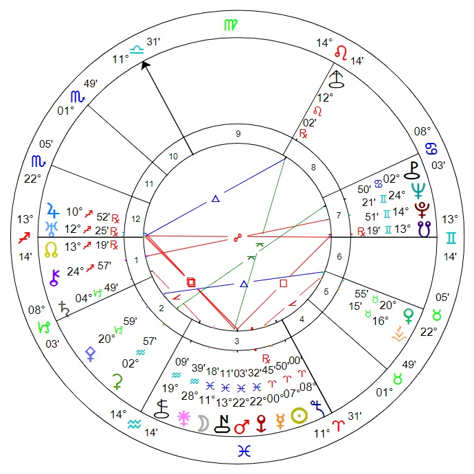 Discovery chart details: Balsamic phase chart with Jupiter and Uranus-North Node rising and Pluto setting. Large third-house stellium including Mercury retrograde. Mathesis was sextile Jupiter. Nessus square Uranus-Node. Moon square Jupiter; Sun conjunct Sedna; Mercury semi-square Vesta. Venus trine Pallas; Mars conjunct Eris; Chiron opposite Neptune. Ceres quincunx Pholus.
