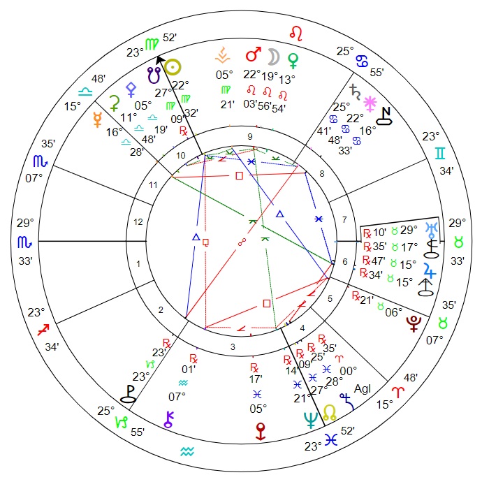 Discovery chart details: Noon. Aglaja was discovered on the Aries Point, semi-square Jupiter-Asbolus. Minor T-square between Neptune, Pluto and Chiron. Mercury quincunx Jupiter-Asbolus; Venus sesquiquadrate Sedna; Mars quincunx Neptune and semi-sextile Juno; Jupiter-Asbolus sextile Nessus; Uranus sextile Sedna. Vesta trine Pluto and opposite Eris; Juno opposite Pholus.