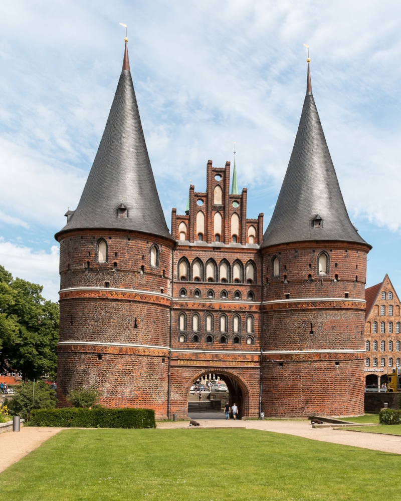 The Holstentor, built in 1464 and the only city gate in Lübeck still standing. Lübeck was a founding city of the Hanseatic League; the gate bears the motto Concordia domi foris pax (Harmony at home, peace abroad). Photo by Dietmar Rabich.