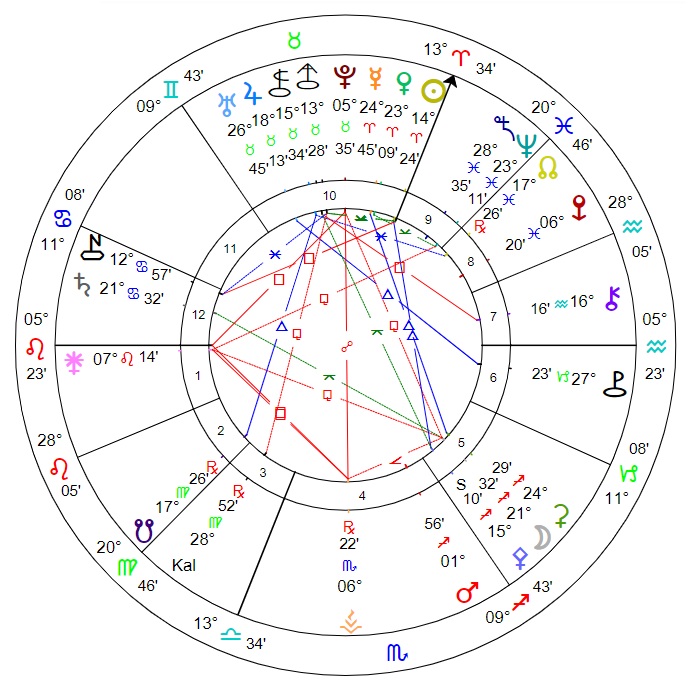 Discovery chart details: Noon. Kalypso was opposite Sedna and sesquiquadrate Asbolus. Stellia in Aries and Taurus. Jupiter sextile North Node. Mercury trine Ceres; Venus semi-sextile Neptune; Saturn sesquiquadrate and Pluto sextile Eris. Uranus trine Pholus; Juno sesquiquadrate Neptune; Vesta opposite Pluto. Chiron square Chariklo.