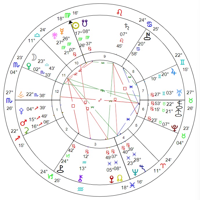 Discovery chart details: Noon. Mercury was retrograde; Saturn was square Pluto, sesquiquadrate Neptune and quincunx the North Node. Venus was quincunx Uranus, Vesta opposite Chariklo and Mars conjunct Ceres.