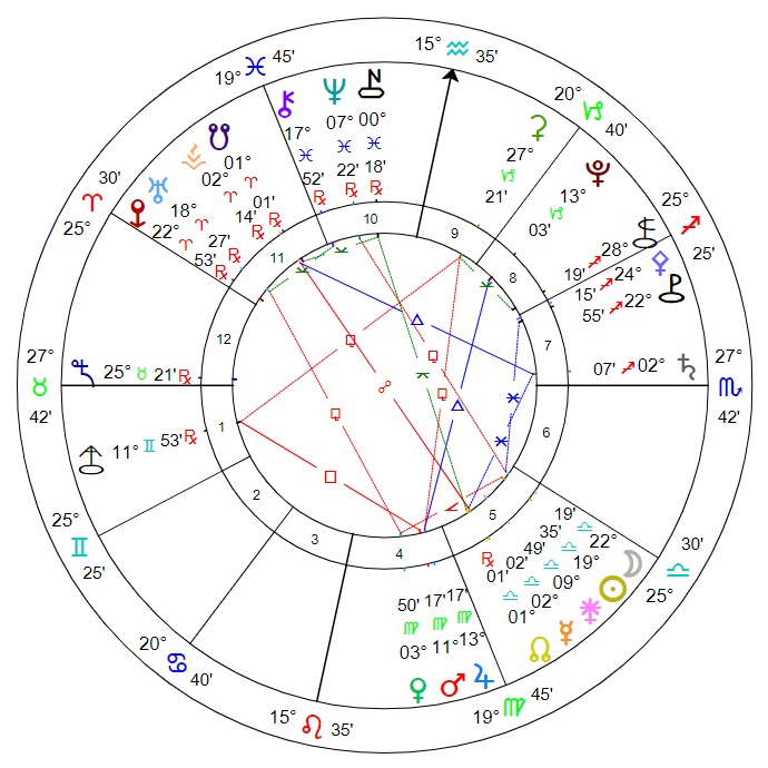 Discovery chart details: New phase chart with Sedna rising and Saturn descending. Stellia in Virgo and Libra; Nessus quincunx North Node. Moon sesquiquadrate Neptune, opposite Eris and sextile Pholus; Sun semi-square Venus. Mercury sextile Saturn and opposite Vesta; Venus sesquiquadrate Uranus; Mars square Asbolus. Jupiter trine Pluto and sesquiquadrate Ceres; Vesta trine Saturn; Chiron semi-sextile Uranus. Neptune semi-square Eris; Juno sesquiquadrate Sedna.