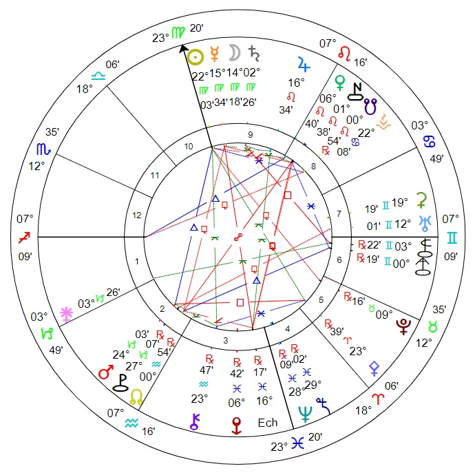 Discovery chart details: Noon. Echo was opposite Mercury, quincunx Jupiter, sesquiquadrate Nessus and semi-square the North Node. Mercury was sesquiquadrate, Nessus opposite and Asbolus trine the North Node. Stellium in Virgo. Venus quincunx Eris; Mars semi-sextile Chiron and square Pallas; Saturn semi-sextile Nessus. Neptune conjunct Sedna; Pallas sextile Chiron. Uranus sesquiquadrate Pholus.