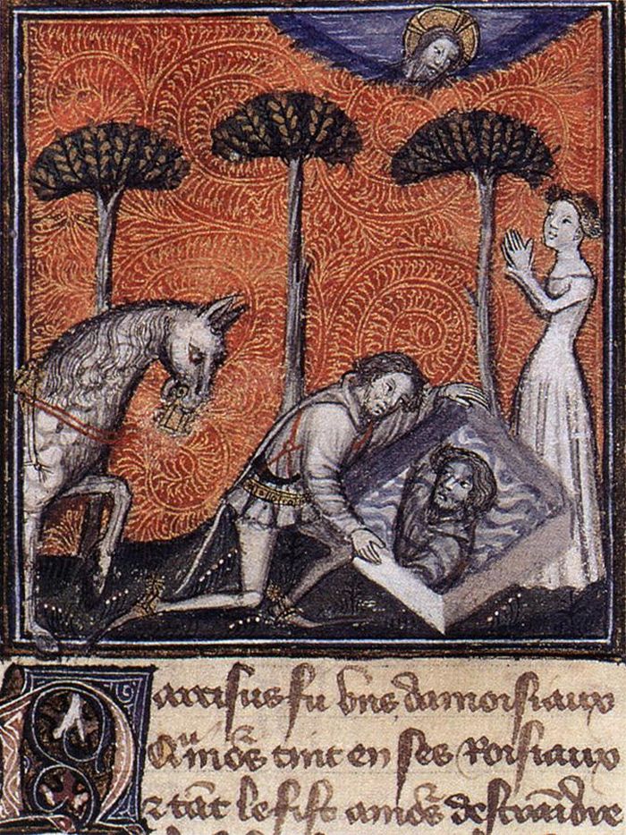 Illustration of the Spring of Narcissus from the 13th-century Le Roman de la Rose. Narcissus is shown kneeling and gazing at his reflection, while Ekho, standing, is petitioning a deity who has appeared above.
