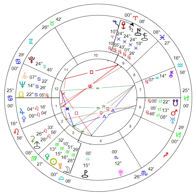 Discovery chart details: New phase chart with Virgo stellium and Yod between Venus, Chiron and Neptune. Nodes on horizon, North rising; Moon on IC. Agnes was likely conjunct Nessus. Moon sesquiquadrate Chiron and semi-sextile Asbolus; Sun sextile Neptune and semi-sextile Pholus. Venus trine Mars; Mars sesquiquadrate Asbolus; Jupiter sesquiquadrate Chariklo. Saturn-Nessus-Eris square Pluto and sesquiquadrate Pallas. Chiron trine Pholus.